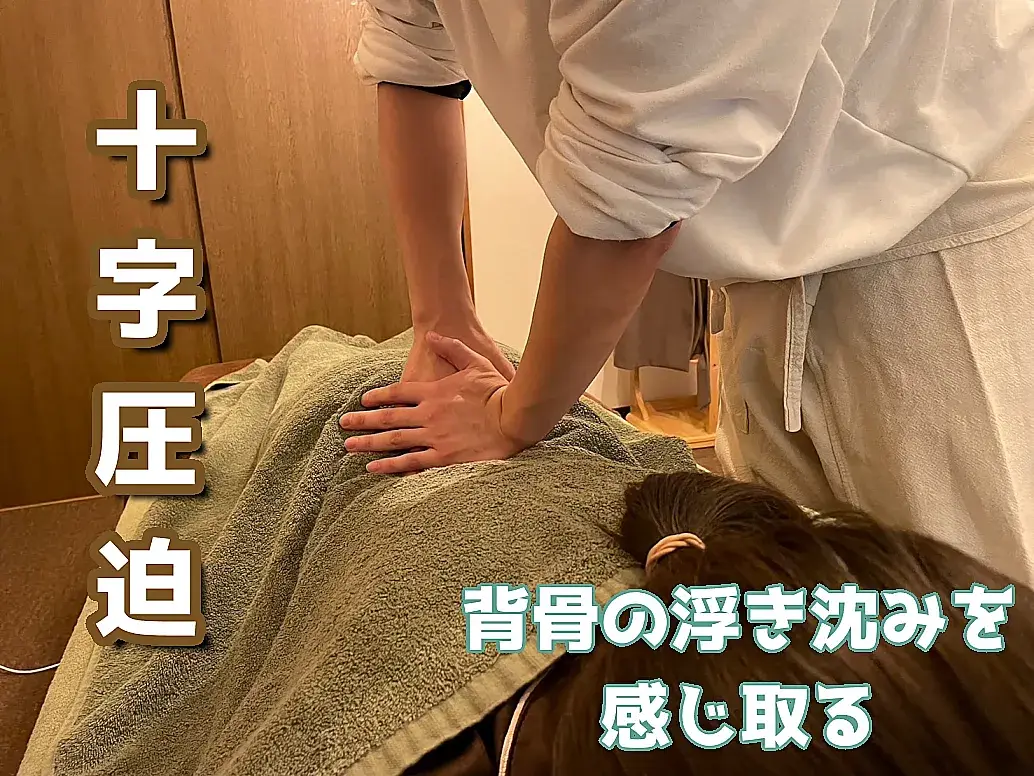 十字圧迫は両手のひらを十字に重ねて背中の上を圧迫して、相手の背骨の動きがどこまで動くかを確認していきます。