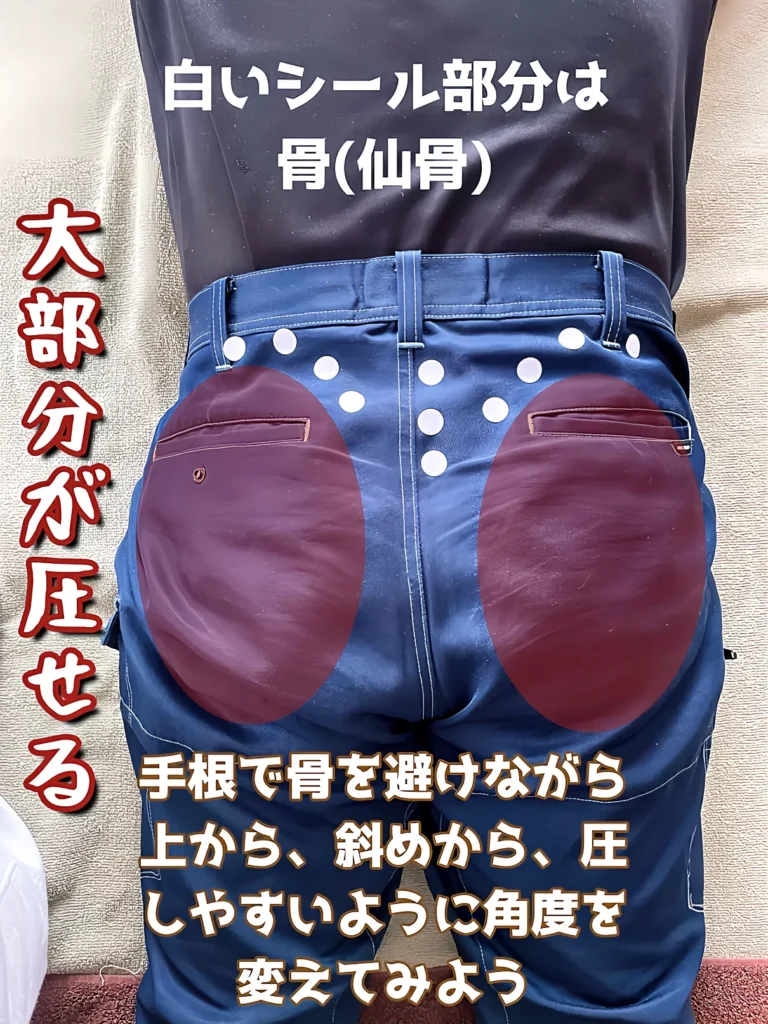 臀部は特に丸みがあるので、滑って圧が逃げないように注意です。