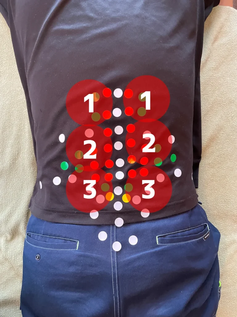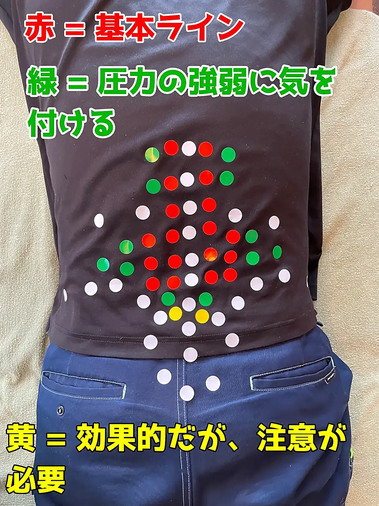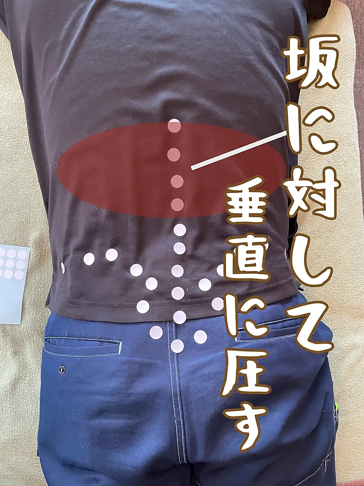 背中から腰にかけて湾曲しております。また、コリが強い背筋は筋肉が盛り上がって丸みを帯びています。曲面に対して、垂直に圧せるように、身体の位置や圧す角度を変化させていきましょう。