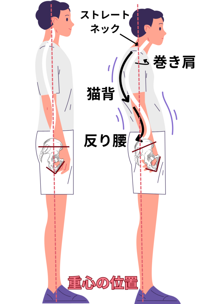 猫背やストレートネックなどで重心が前側に集中している方は、骨盤が後傾して腰を反らせてバランスを取ってしまいます。