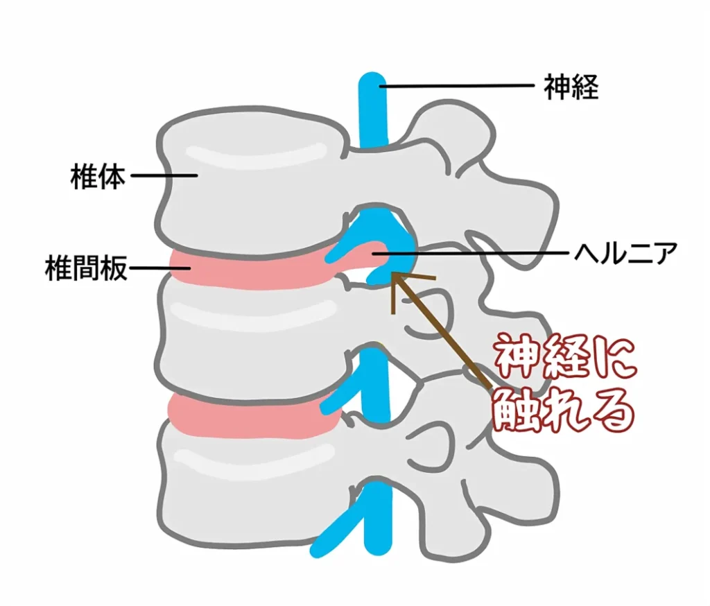 椎間板ヘルニアとは、背骨の連なってる骨と骨の間にある軟骨組織(椎間板)が、歪みや負担によって骨同士に圧迫されて、圧しはみ出た椎間板で神経を圧迫している症状です。